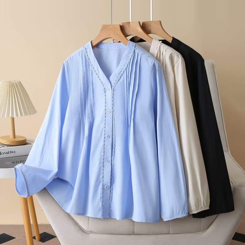 2024秋の太った妹のシャツのレースの襟のvネックの長袖の気質の綿のシャツの大きいサイズの婦人服のしわのシャツの6170
