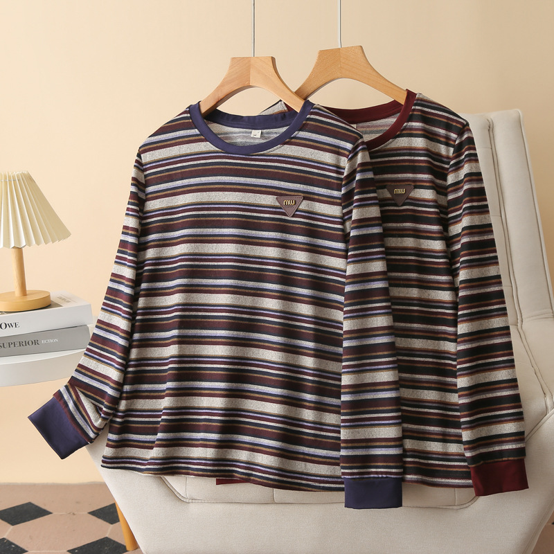 大きいサイズの婦人服のストライプのtシャツの長袖はやせています。