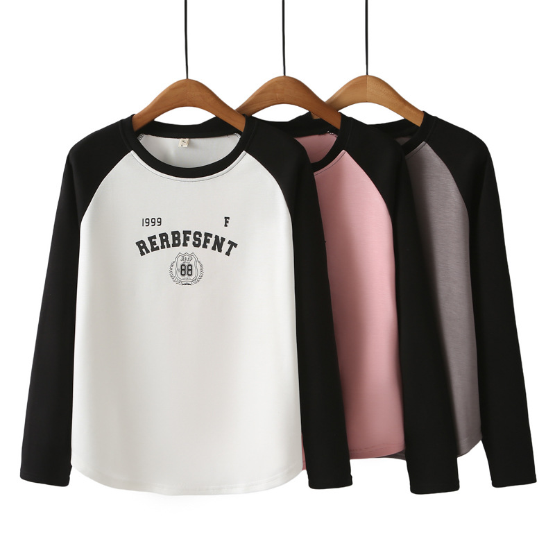 2024秋の底のシャツの女性の大きいサイズは色にぶつかって肩の長袖の上着の200斤の太っているMMのアルファベットのtシャツの空気の層の938に挿します。