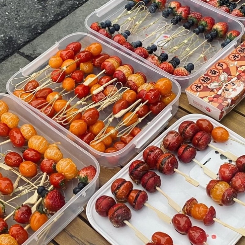 陳列トレーの商用出店の氷砂糖瓢箪の小串皿に砂糖瓢箪ネットの赤い箱を置いて皿を展示します。