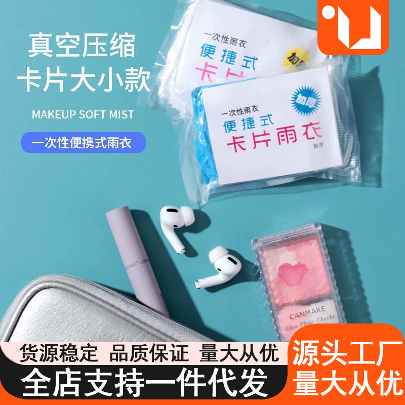 携帯用使い捨てカードレインコートのロングタイプの全身真空圧縮PE帽子のひもが緩んでいます。