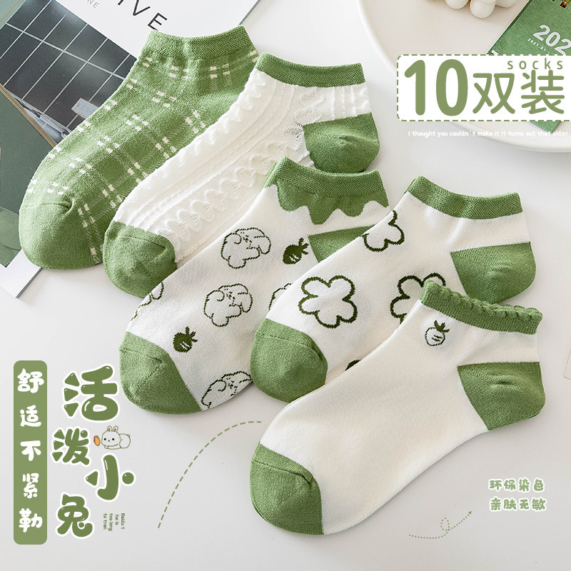 靴下の女性の春夏の新型の日本の青春の緑の船の靴下の漫画のウサギの通気性の綿の靴下の工場の現物は卸売りします。