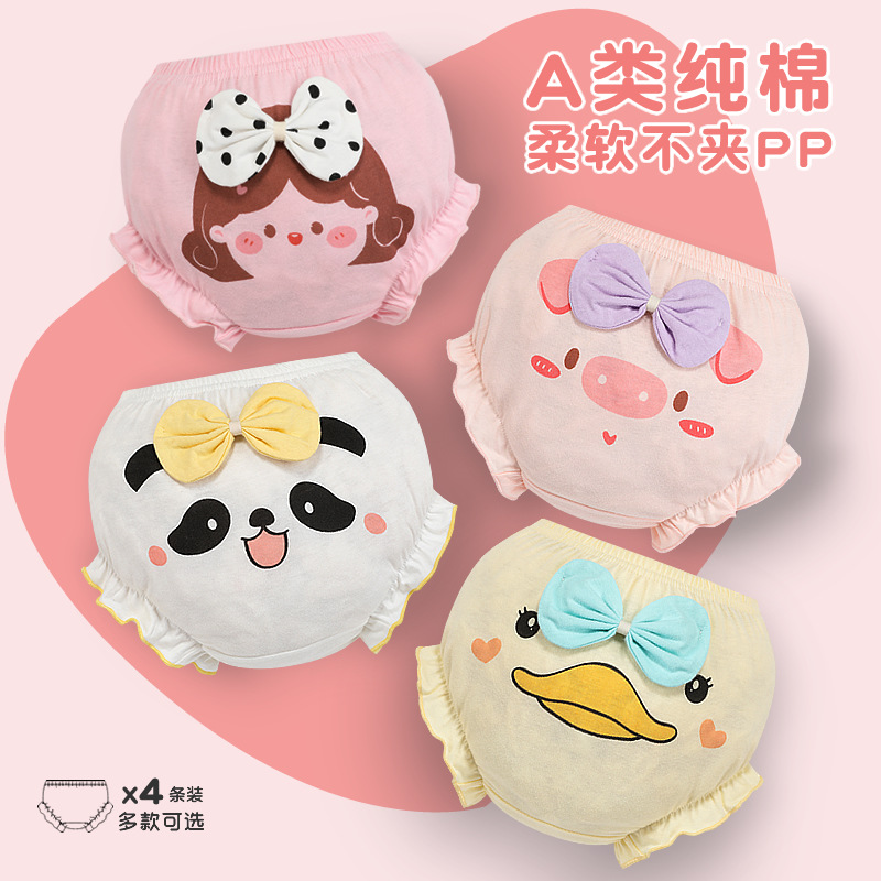 三角純綿二重のハスの葉の縁の蝶結びの外は薄い金のメーカーの直接販売の漫画のかわいい子供の下着のパンのズボンを着ます。