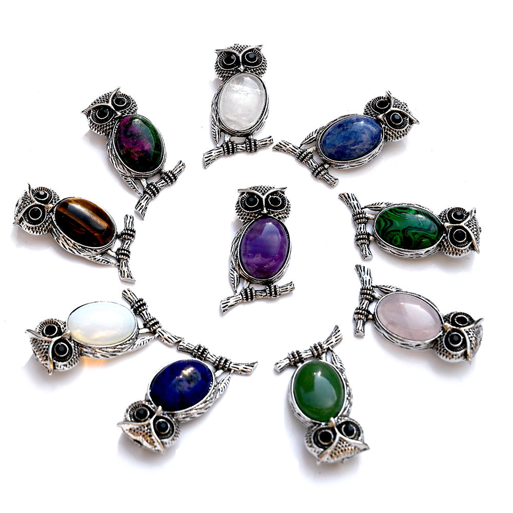 ナチュラルストーンowl necklace trフクロウネックレス天然水晶紫結晶玉ペンダント