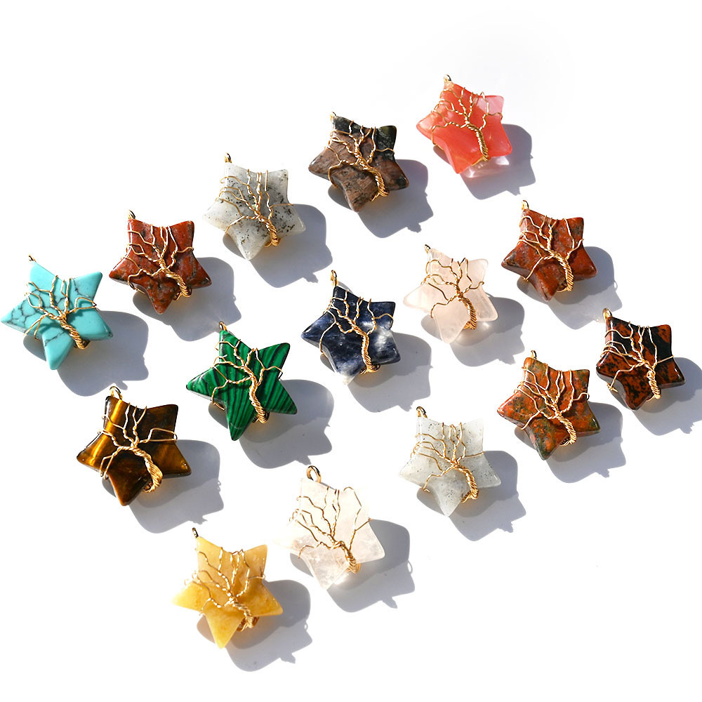 星ペンダント天然水晶紫晶虎眼巻線生命樹粉晶黄玉拉長石五角星ネックレス