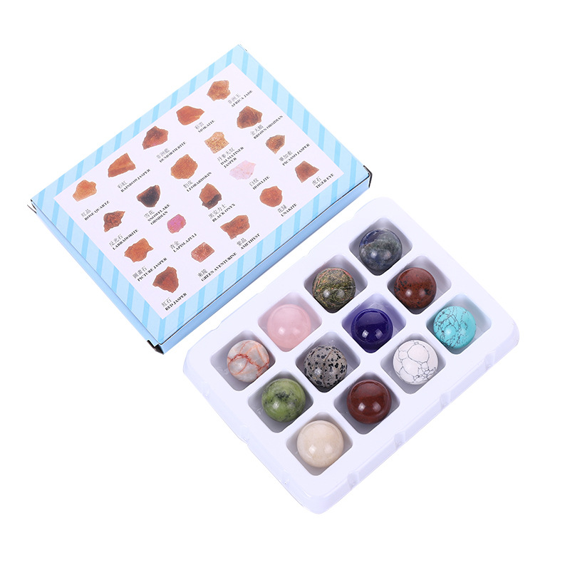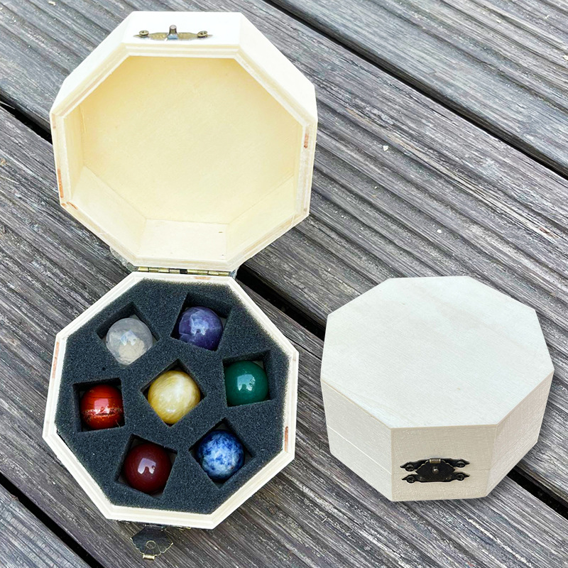 Chakellaチャクラボール鉱石セット水晶石紫晶メノウ玉多角形木箱工芸品
