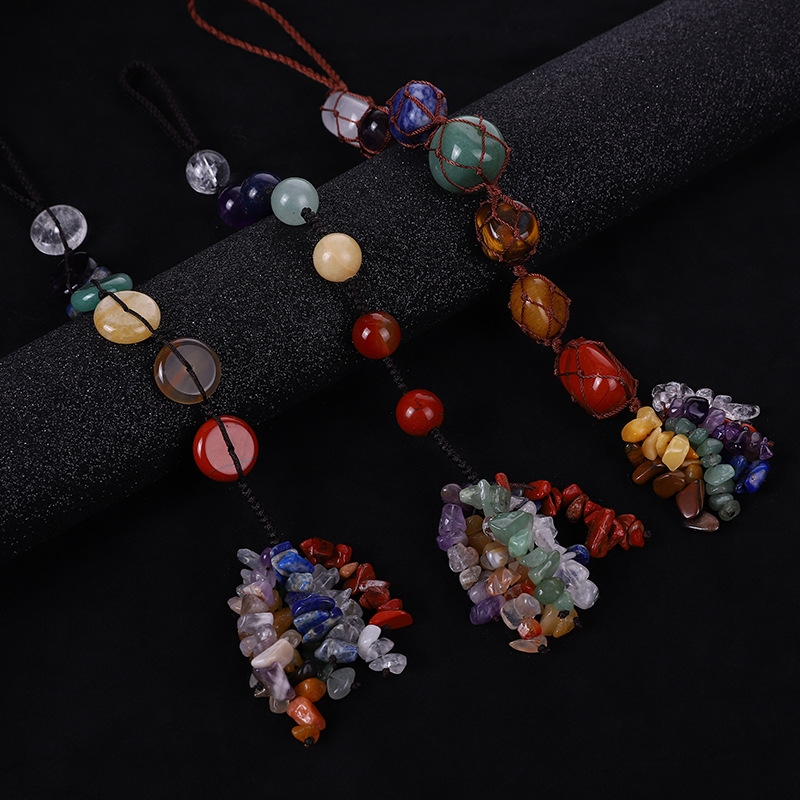 チャクラの丸いボールの車は天然水晶の石の七色の原石の円形を掛けて手編みをして国境を越えて卸売りします。