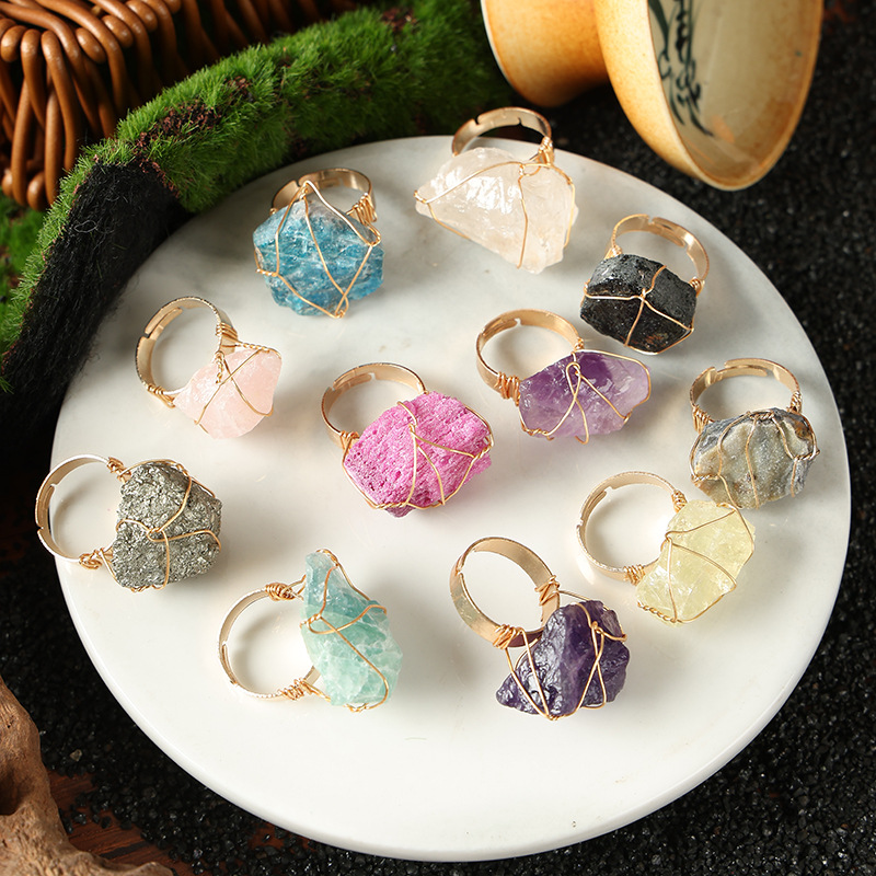 天然石黄水晶原石紫晶指輪粉晶巻線原鉱指輪DIY巻線水晶石活口