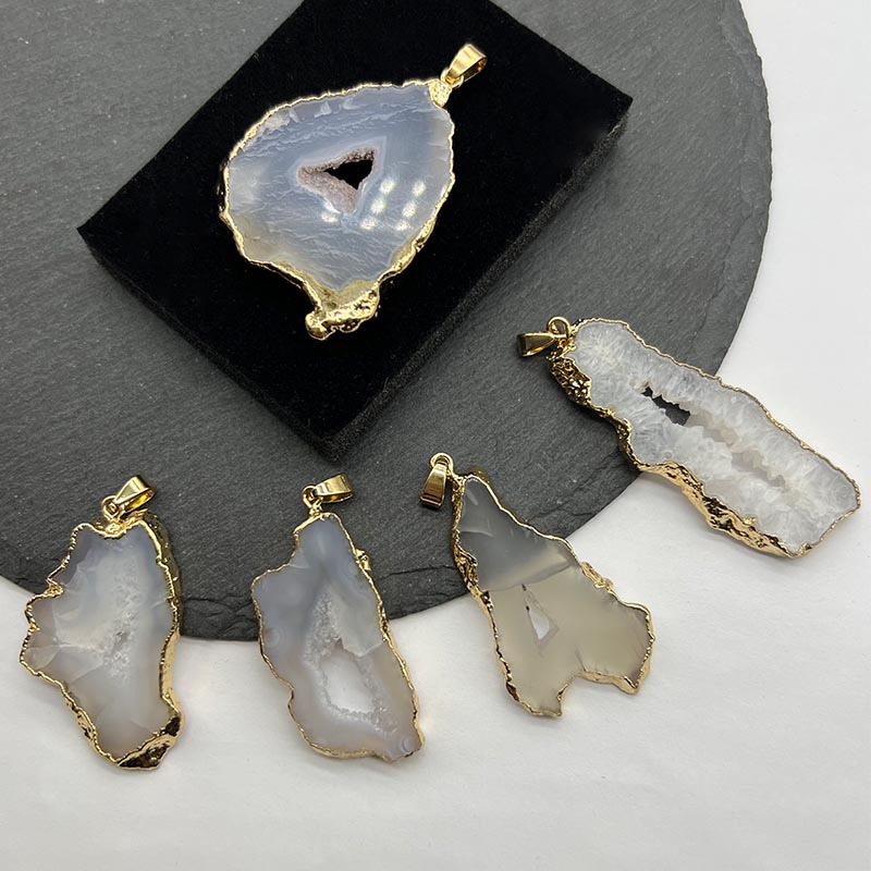 クロスボーダー輸出天然瑪瑙晶洞晶芽不定形保色メッキバッグ14k金欧米毛衣チェーンペンダント