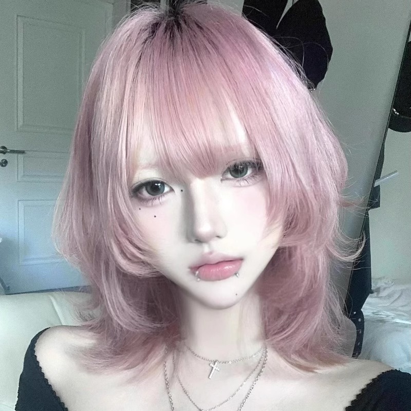 かつら全頭カバー女性ピンク系日常自然鎖骨髪シミュレーション髪自然層短巻き髪