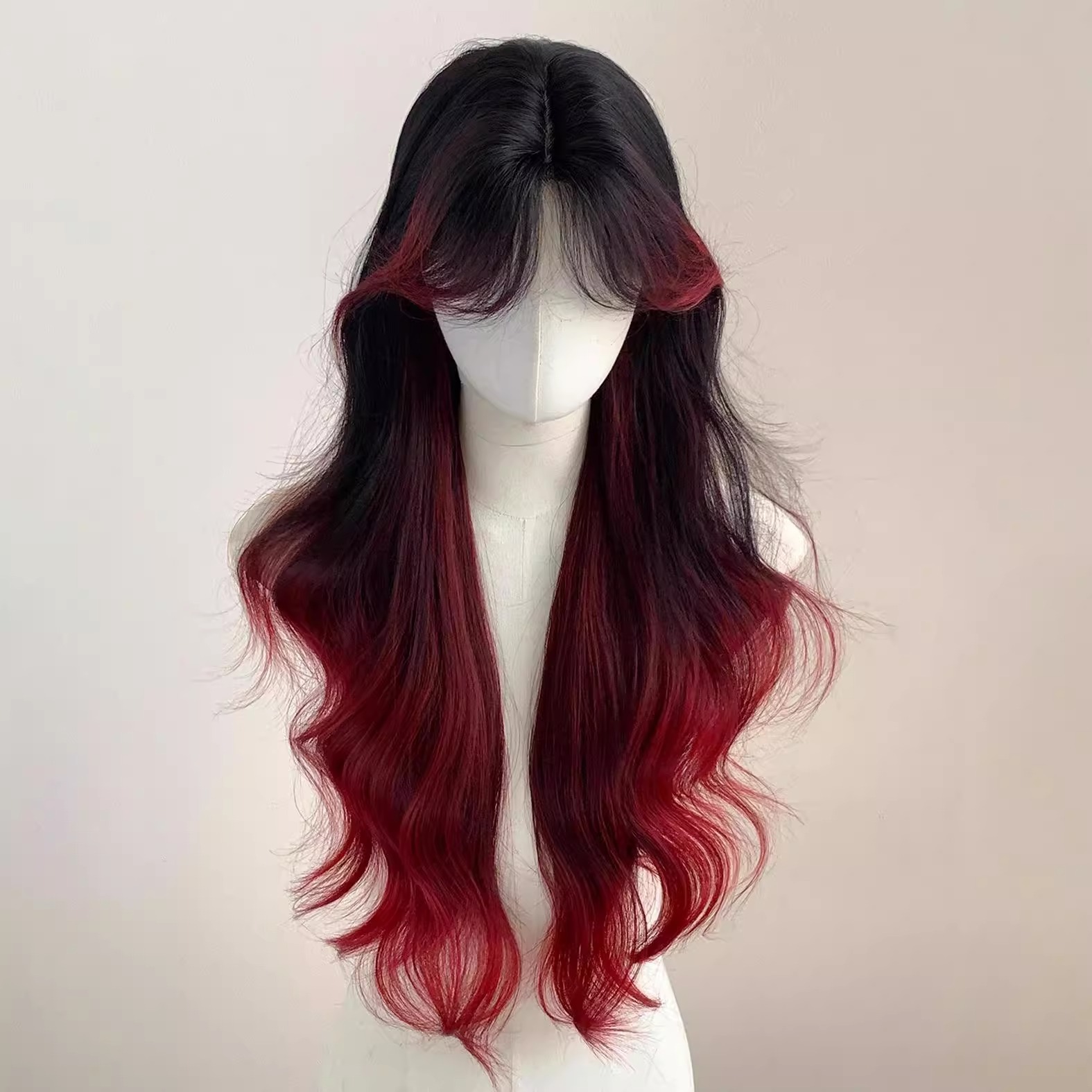【アイリスレッド】かつら全頭カバー女性黒紅は八の字の前髪の長いカールを染めます。