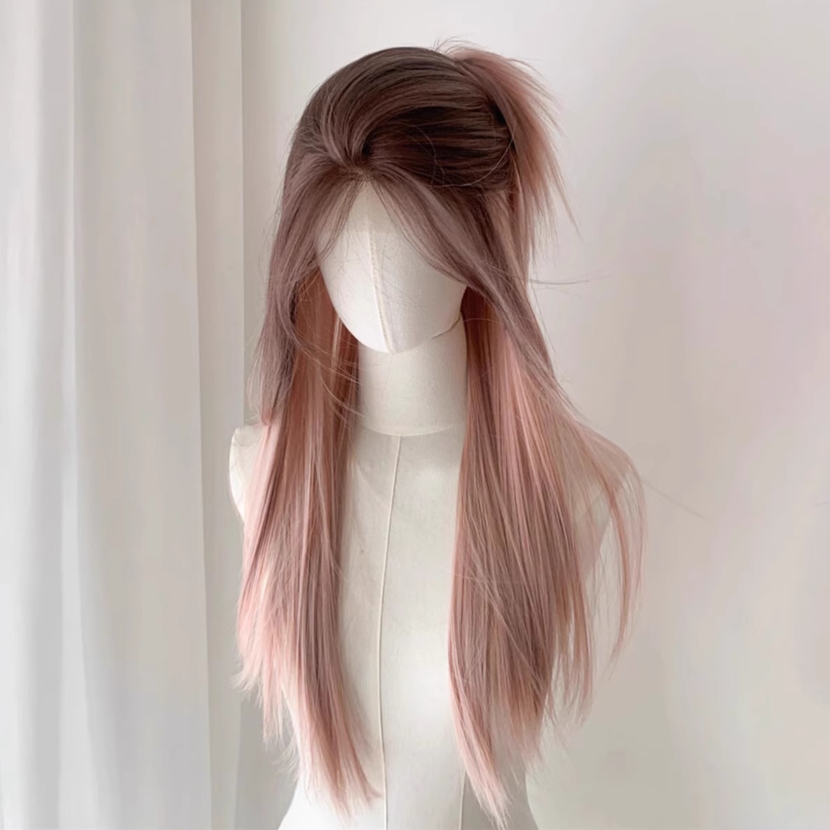 [Keluli Style] 女性用フルウィッグ、中間分け、バタフライバング、甘くてクールなピンクのロングストレートヘア、トップ染め人工毛