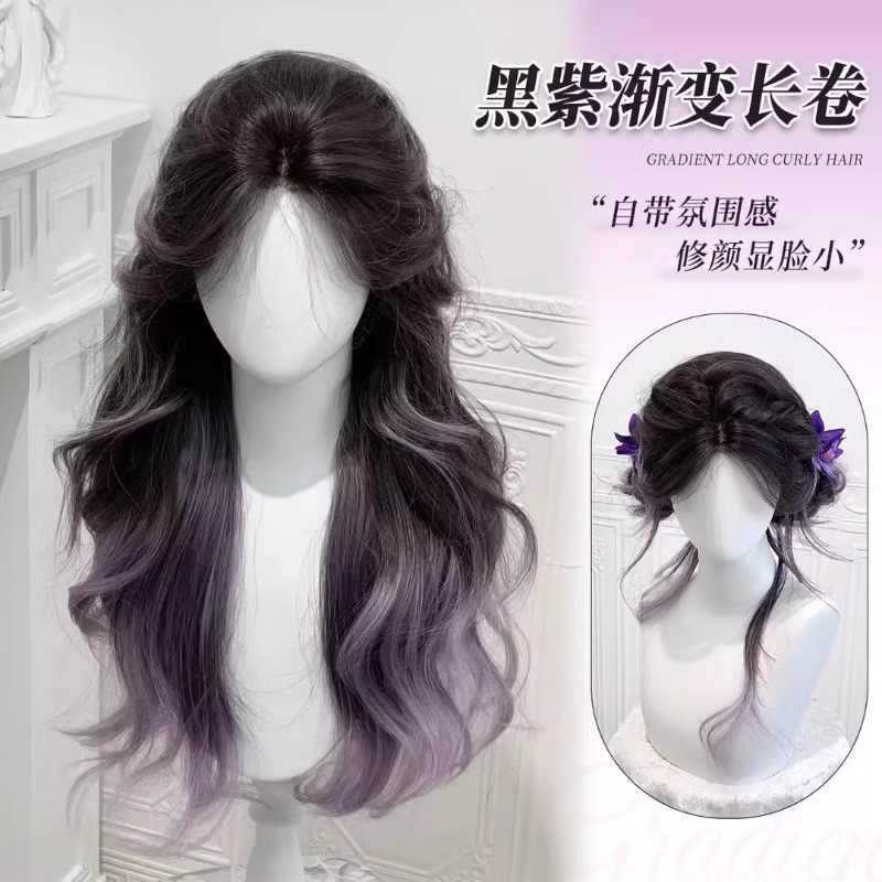 かつらの全頭カバーの女性は日常的に自然に髪の中で長いカールを分けてパリで黒紫グラデーションのかつらを染めます。
