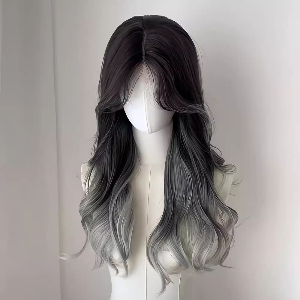 かつらの全頭カバーの女性はグラデーションの灰色の長い巻き髪を染めます。