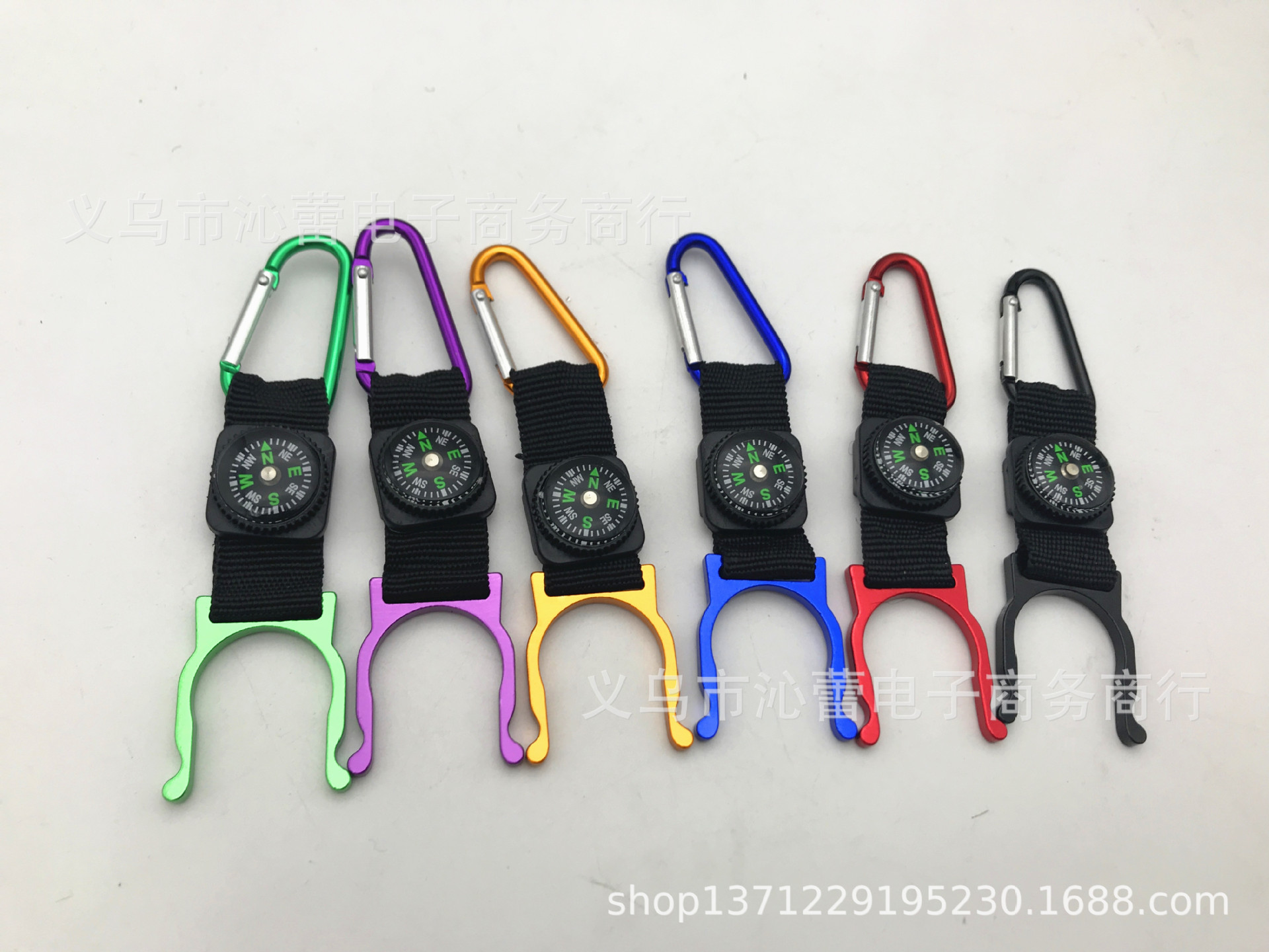 アウトドア用品は羅針盤の水筒を持って登山のミネラルウォーターの瓶を掛けます。