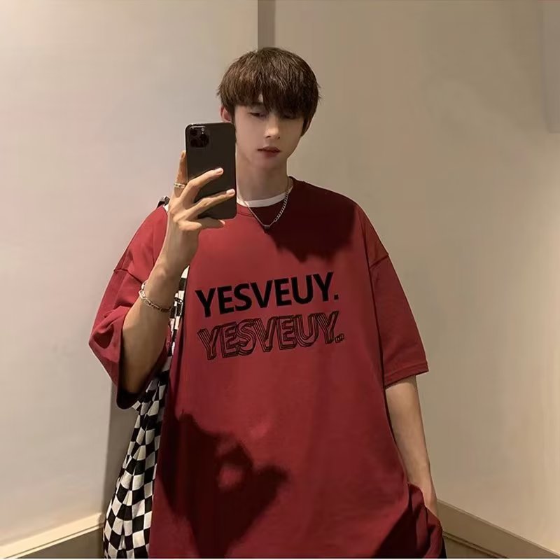 ワインレッド2023半袖tシャツ男性潮牌トレンドアメリカ復古oversize欧米高街半袖重ポンド