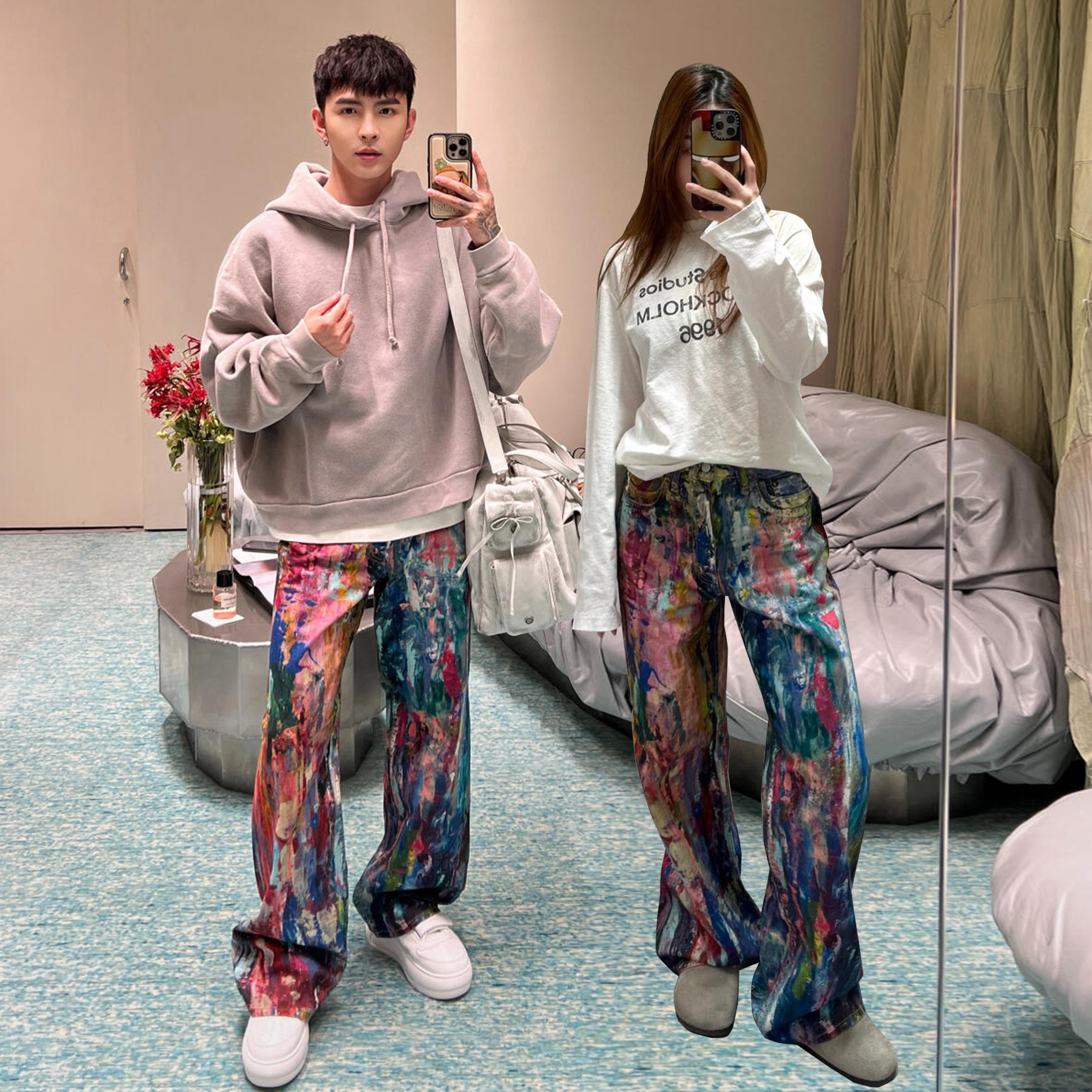 高品質版AC2024秋冬3Dプリント男女兼用油絵ペイントパレットストレートジーンズ