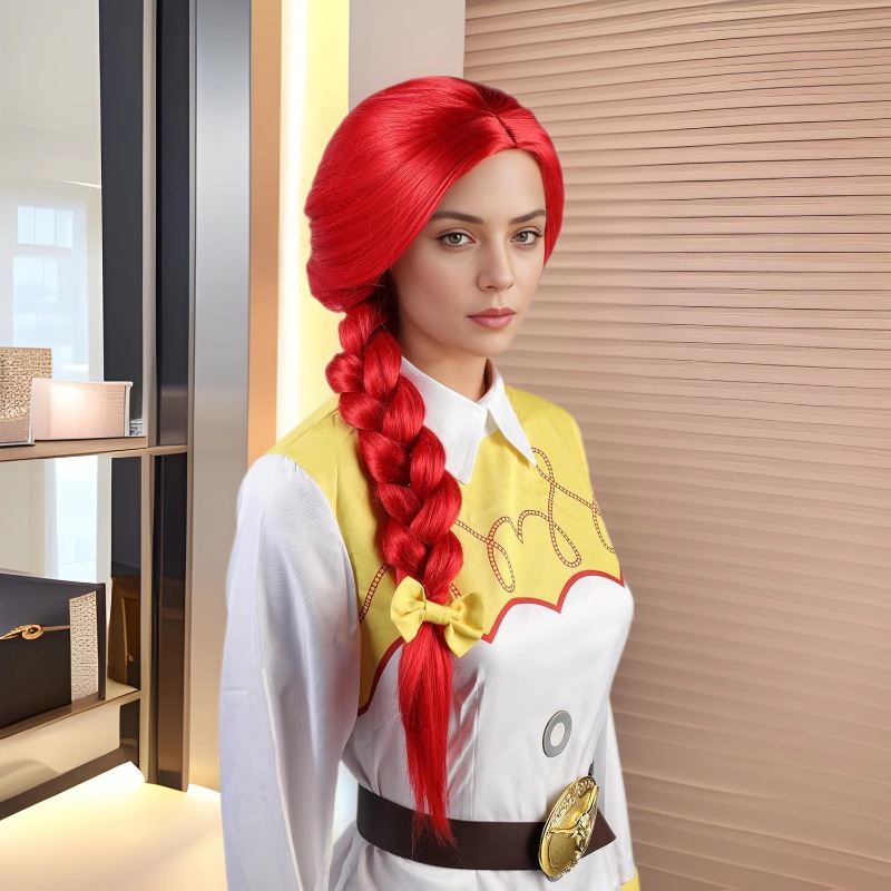 赤いロング三つ編みウィッグ前髪なしアニメプリンセス COS ウィッグファッションレディドレスアップパフォーマンスウィッグ