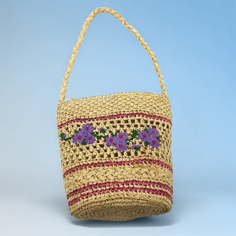 円筒形のシングルショルダー、小花刺繍入りラフィア編みバッグ、編み込みリゾート風フレンチハンドバッグ、ビーチバッグ、斜め掛け、多用途