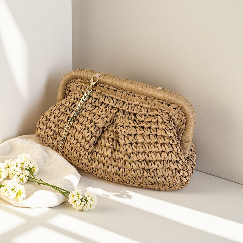 シンプルな手持ちスタイルの女性用バッグ、夏の新しいスタイルの麦わらバッグ、ファッショナブルなチェーンビーチバッグ、女性用クロスボディバッグ
