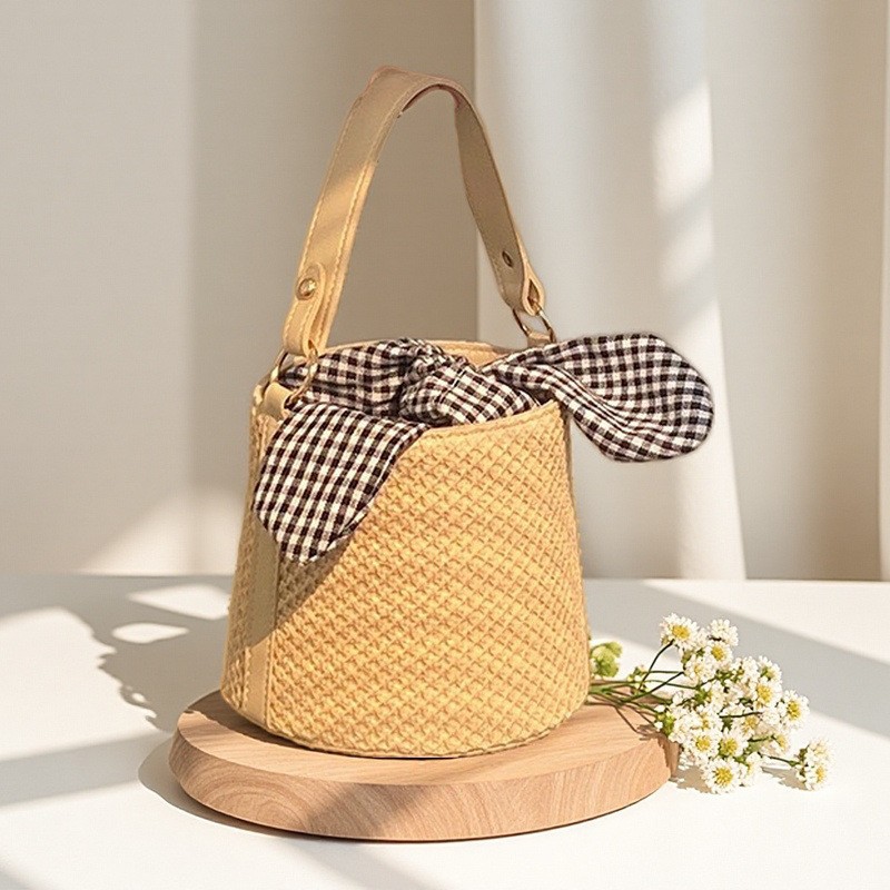 蝶結びチェック柄バケツストローバッグ女性のための 2025 新しいファッション多用途ワンショルダークロスボディ西洋スタイル織ハンドバッグ