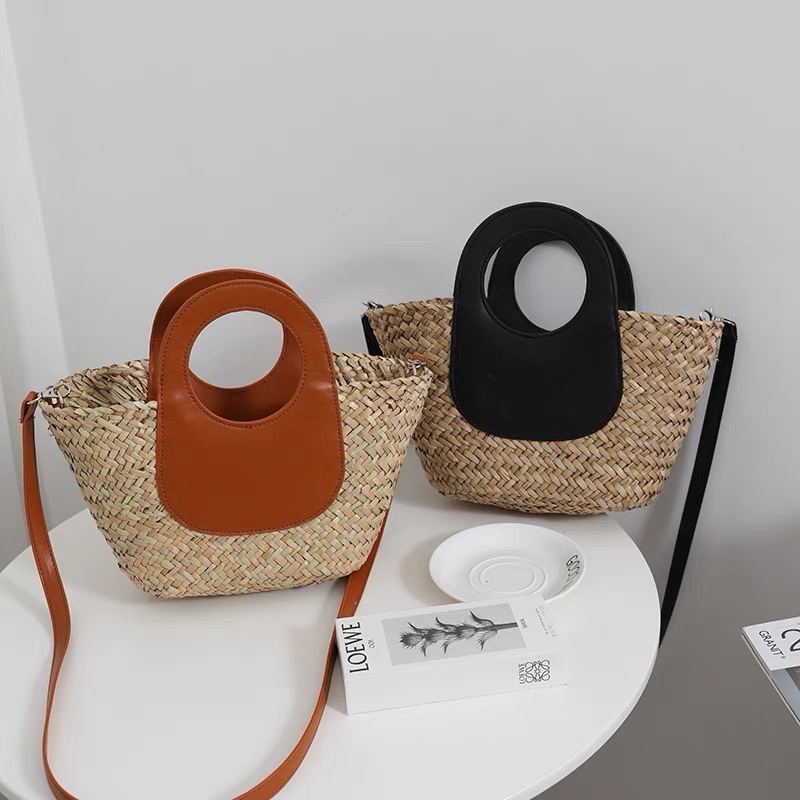 ニッチな森風麦わらハンドバッグ、ネットセレブと同じスタイル、大容量、リゾート風、写真撮影、通勤トートバッグ、シンプル