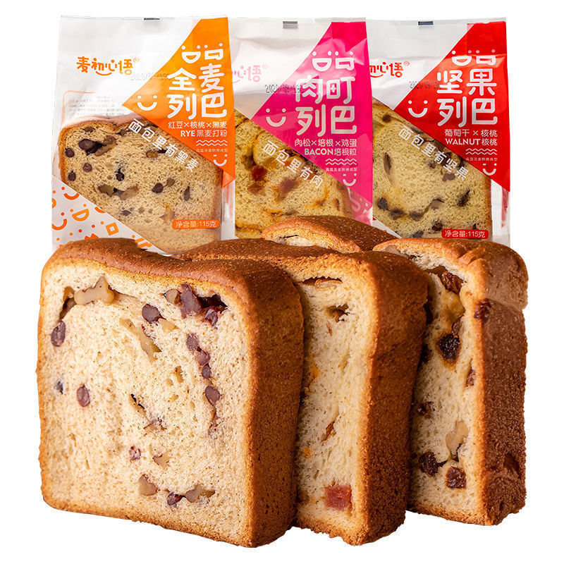 全粒粉のレバスライストーストパン、ライ麦、小豆、くるみ、朝食用ペストリーの全箱を満たすように選択してください。