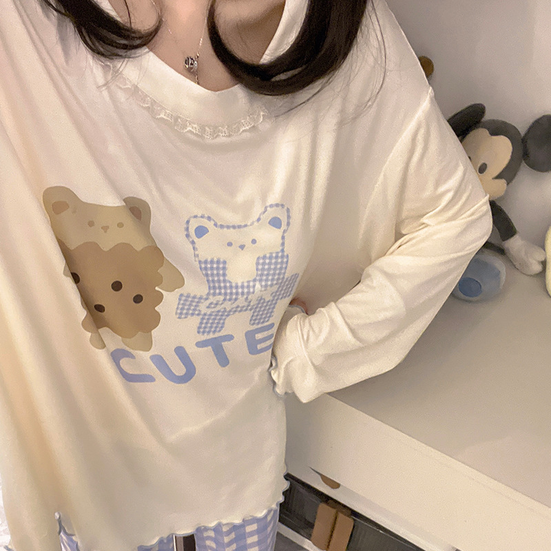 女性用パジャマ、胸パッド付き長袖モーダルコットン、甘くてかわいい女の子のホーム服、韓国風ルーズスーツ