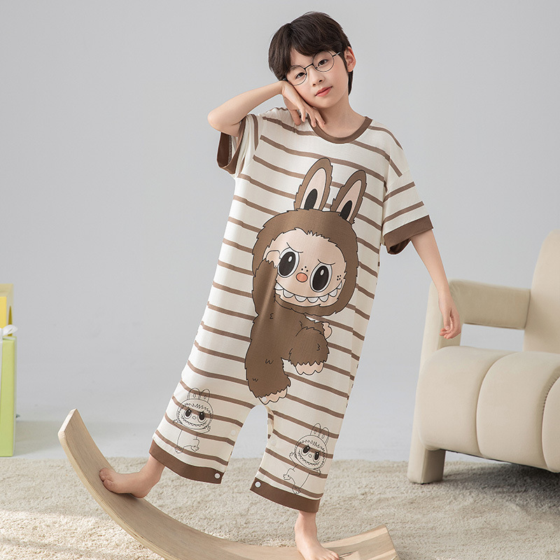 子供用ワンピースパジャマ、男の子用半袖モーダル夏中型および大型子供用漫画男の子用アンチキックキルトワンピースホーム服