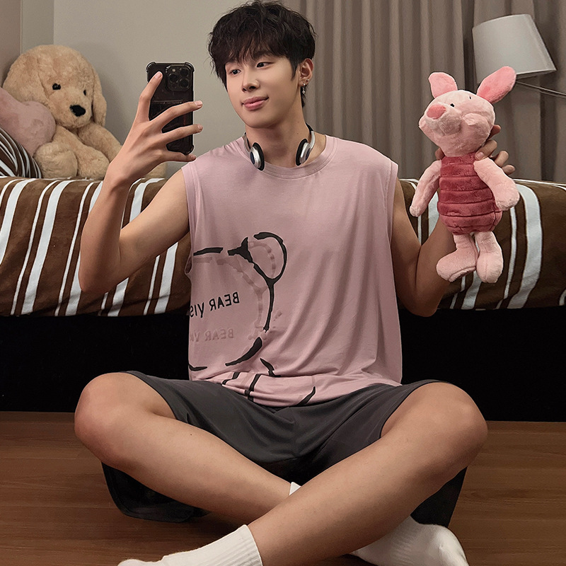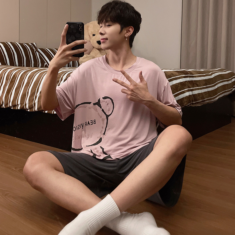 メンズスーツパジャマ春と秋半袖メンズモーダル薄いかわいい漫画ホーム服セットハーフベルベットドイツベルベット