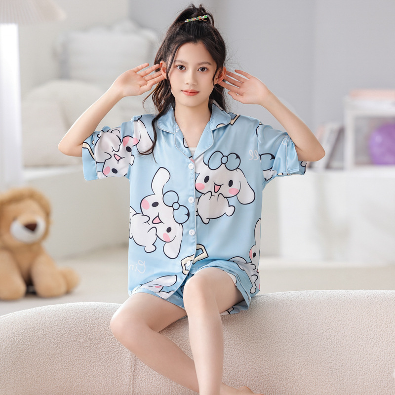 子供パジャマ女の子夏のアイスシルクサテン半袖薄い子供女の子漫画セット空調ホーム服綿