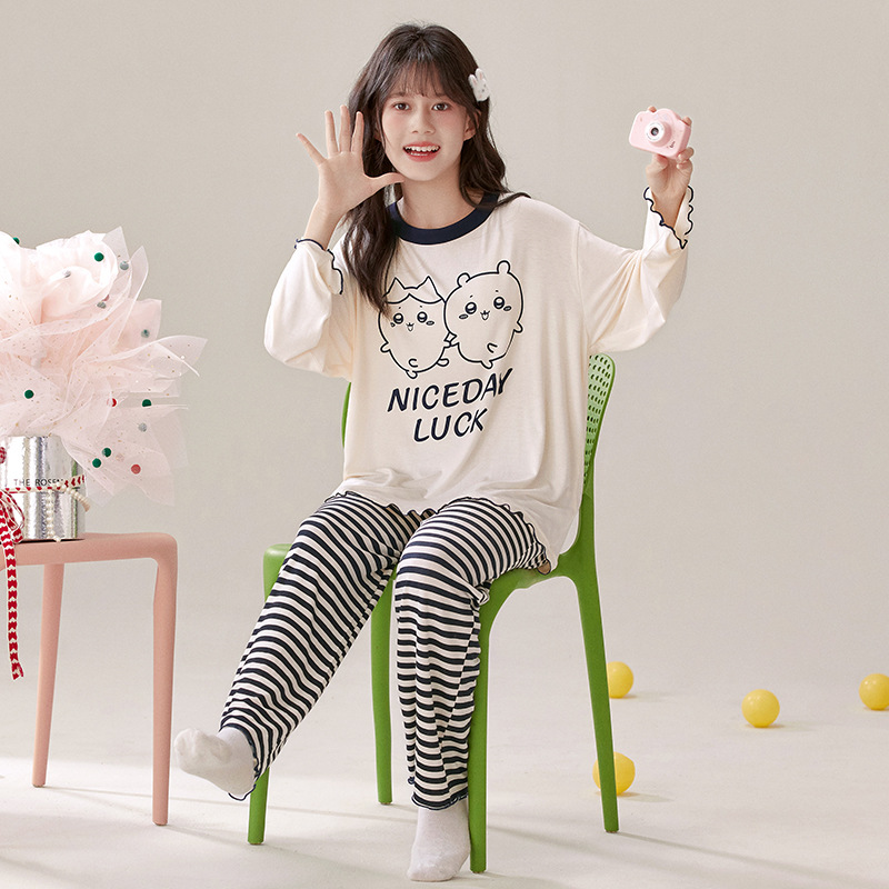 女の子のパジャマのモーデール長袖の甘くてかわいい少女の丸首の家の服の韓国版のゆったりしているスーツの綿の現物