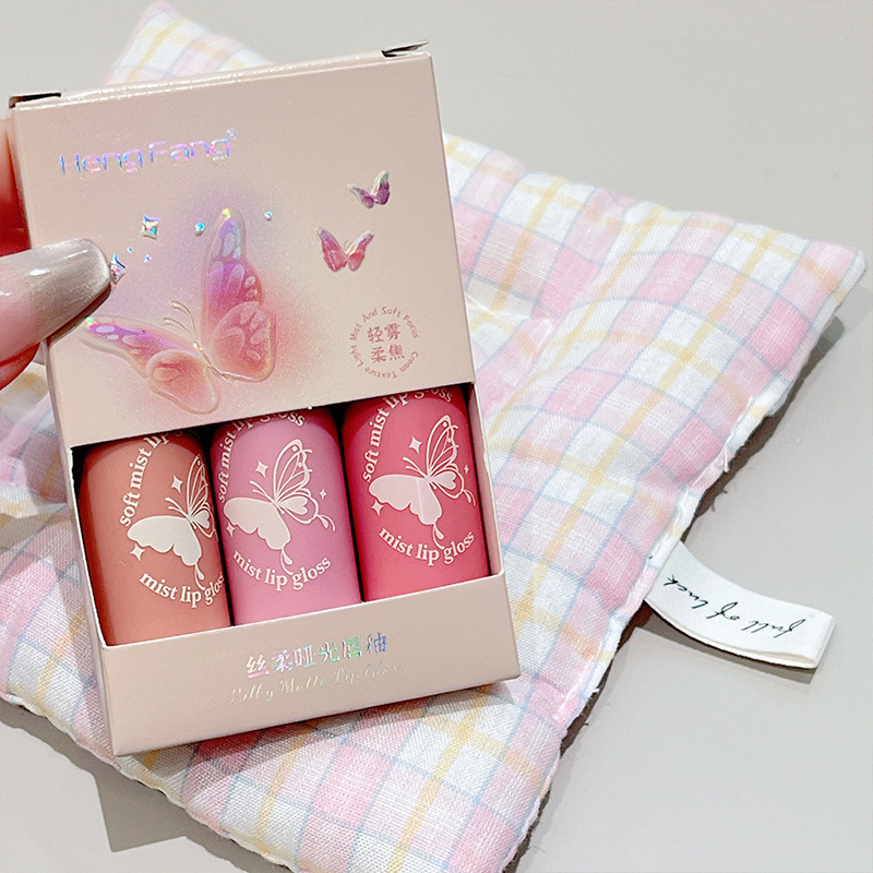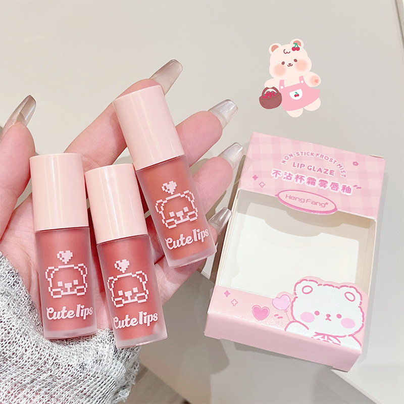 恒芳の熊の霜の霧の唇の釉薬の3本の服のスーツは白い色の霧の顔のつや消しの唇の色の学生の党の平価の化粧を現します。