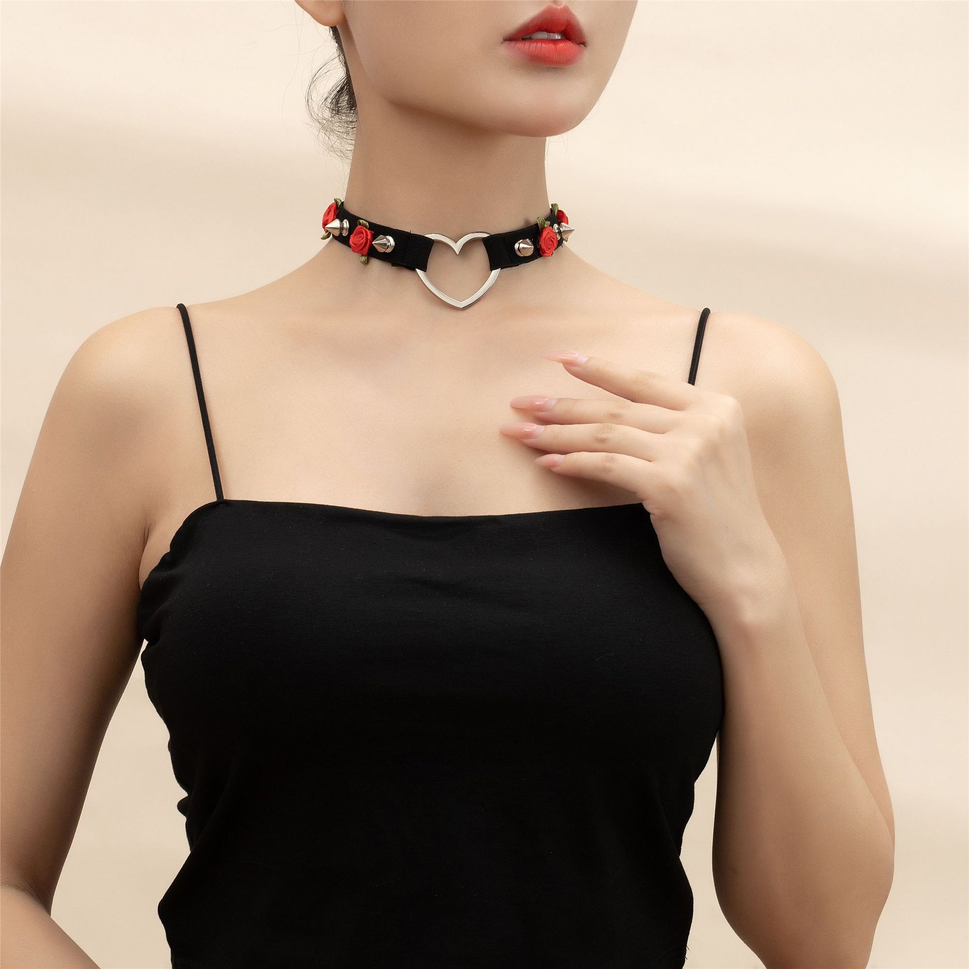 欧米のパンクの個性の尖ったリベットの桃の心の愛の花の首輪のメイドの首輪のネックレスの鎖