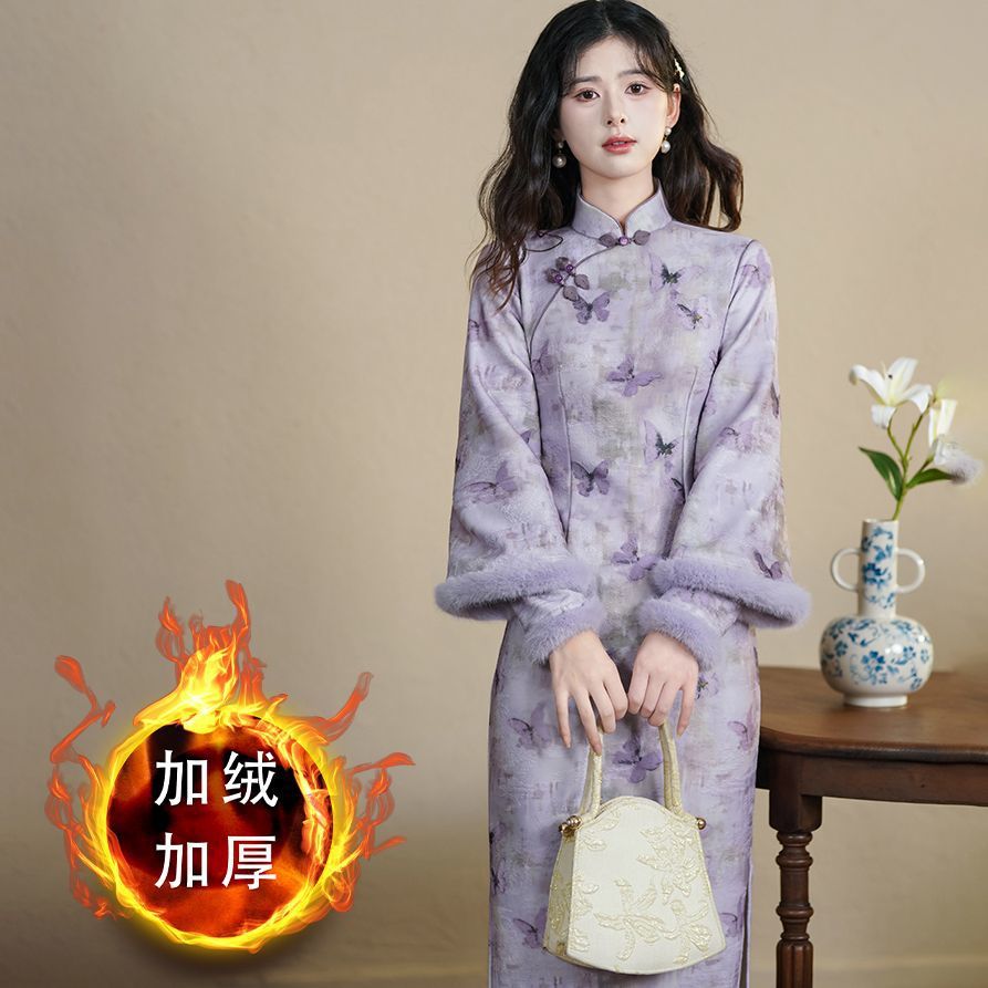 紫のチャイナドレスは冬にベルベットを厚くして、新中国式改良優しい文芸超仙日常ワンピース