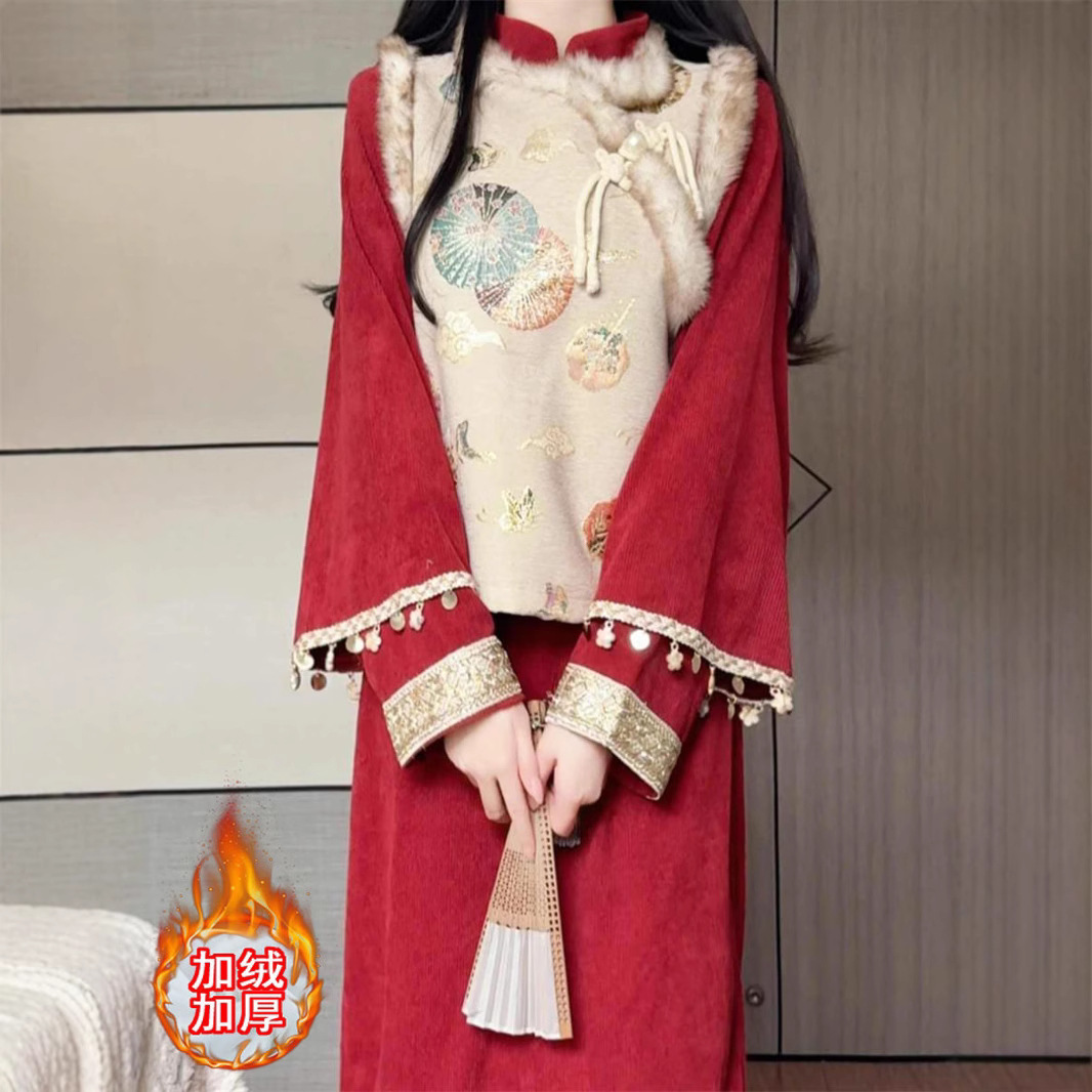 2024年秋冬新作改良ベストチャイナドレス復古民国風少女厚手赤色ロングスカート2点セット