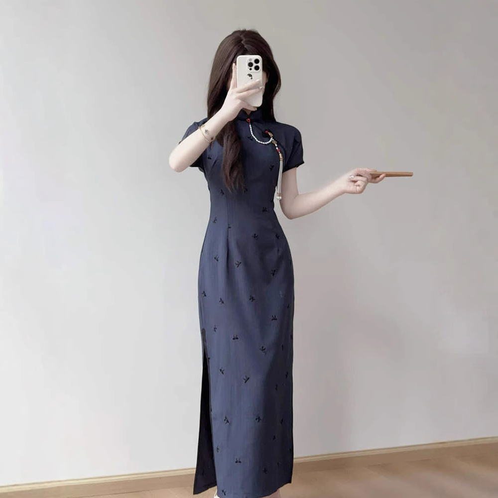 チャイナドレス2025夏新作新中国風文芸レトロブルー改良気質文芸範素雅ワンピース女性