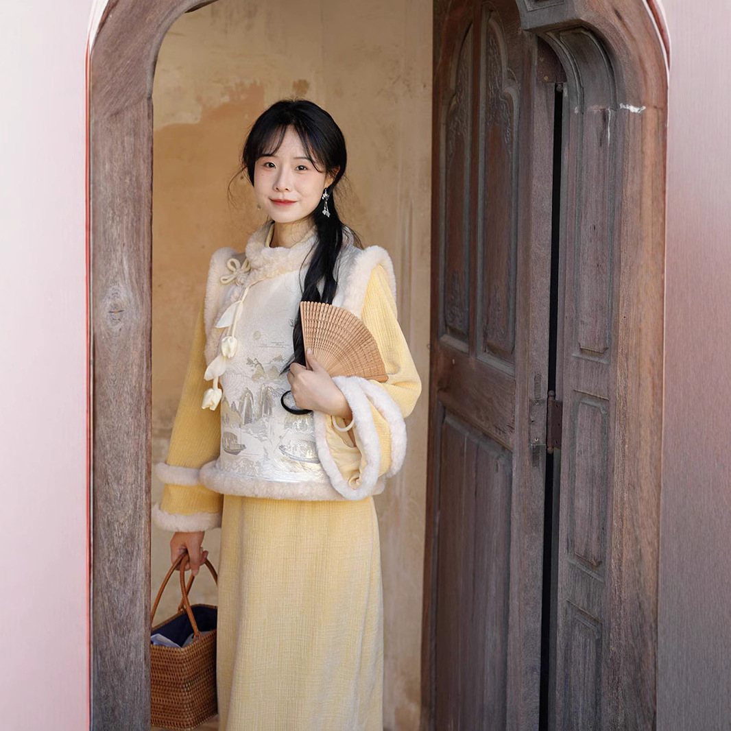【小黄チー】超仙馬甲優し系黄色保温中長チャイナドレス2024冬の新型2点セット