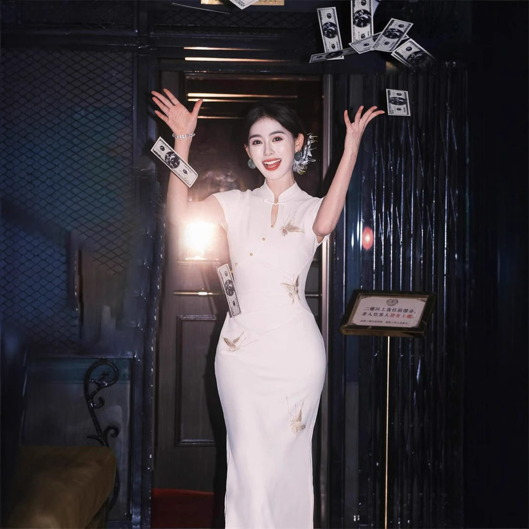 白い袖なしのチャイナドレスの女性の新しい中国式2025年の優雅な気質の新型の婚約して身を修めるドレスは日常的に着ることができます。