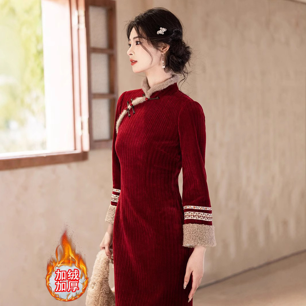 ベルベットの厚い改良チャイナドレス少女の若いモデル中国風の優しい修身ワンピース綿馬甲セット冬