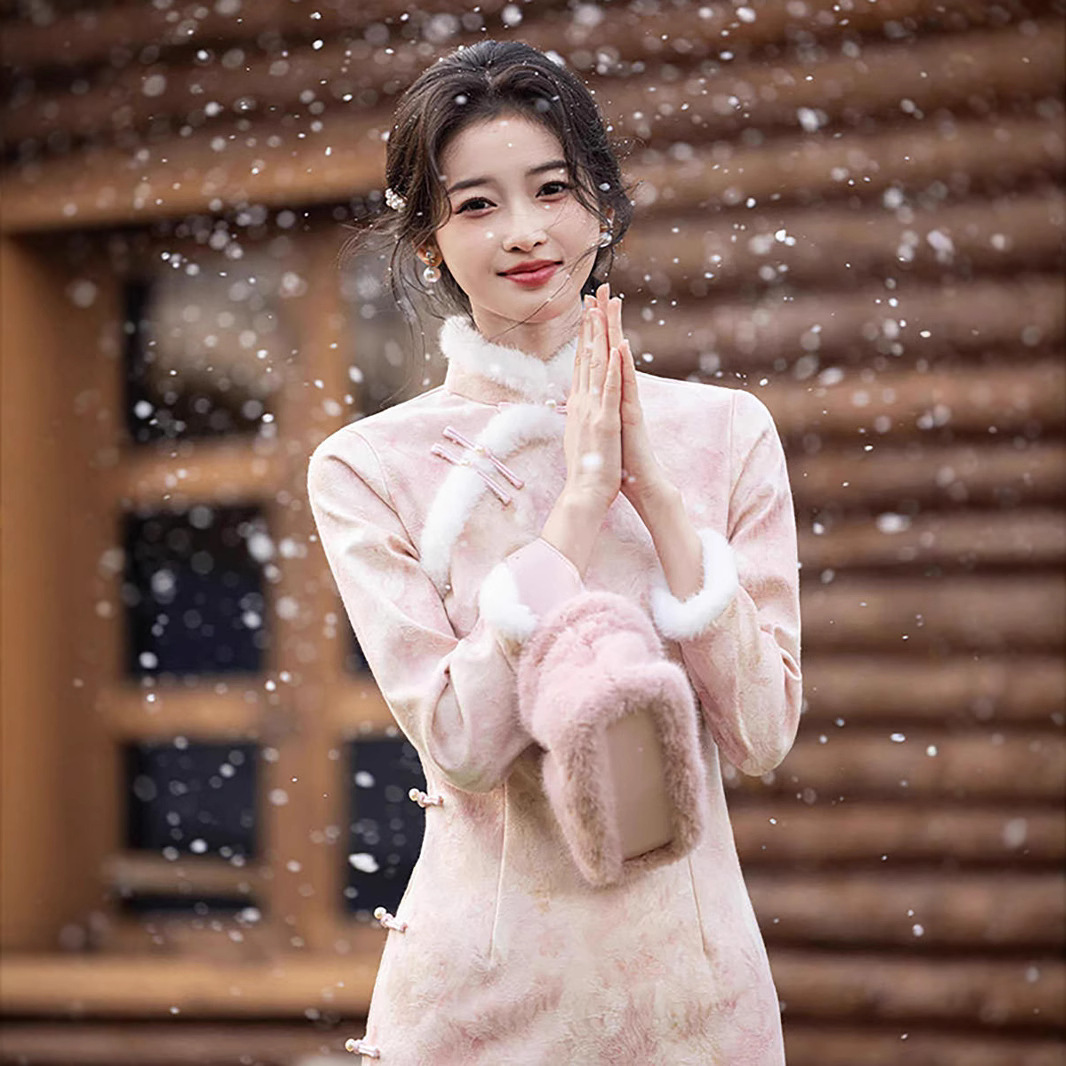 ピンク新中国式チャイナドレス2024新秋冬修身高級気質高級若い少女仙… は...