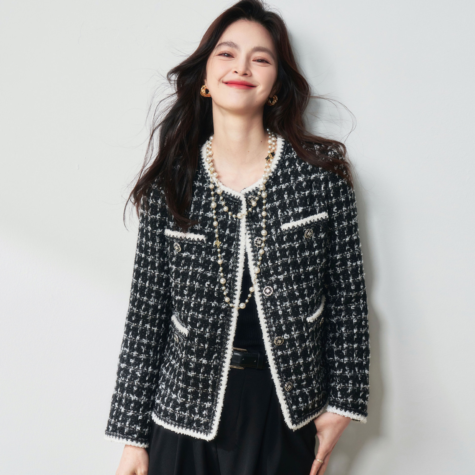 25 クリアランス春の新スタイルフレンチライトラグジュアリースタイルクラシック黒と白の市松模様の蝶糸ツイードスモールフレグランスジャケット 25009