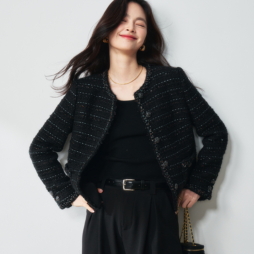 25 クリアランス 春 ブラック ブライト シルク ウール ストライプ 手織り レディース デザイン スモール フレグランス ジャケット 18265