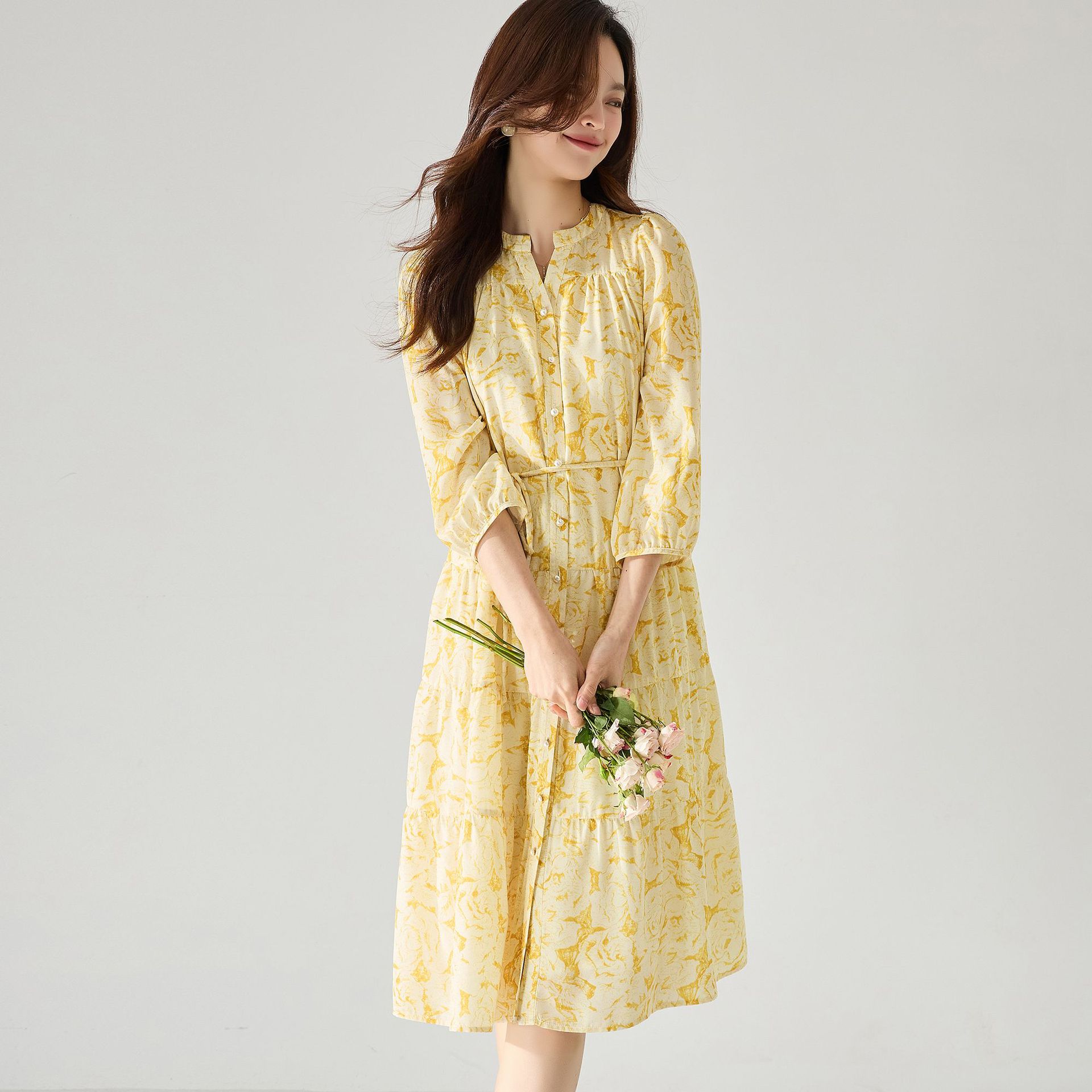 25クリアランス新しいフレンチジェントルスタイルイエローティーブレイク花柄ロングスカートホリデースタイルウエスト痩身ドレス15560