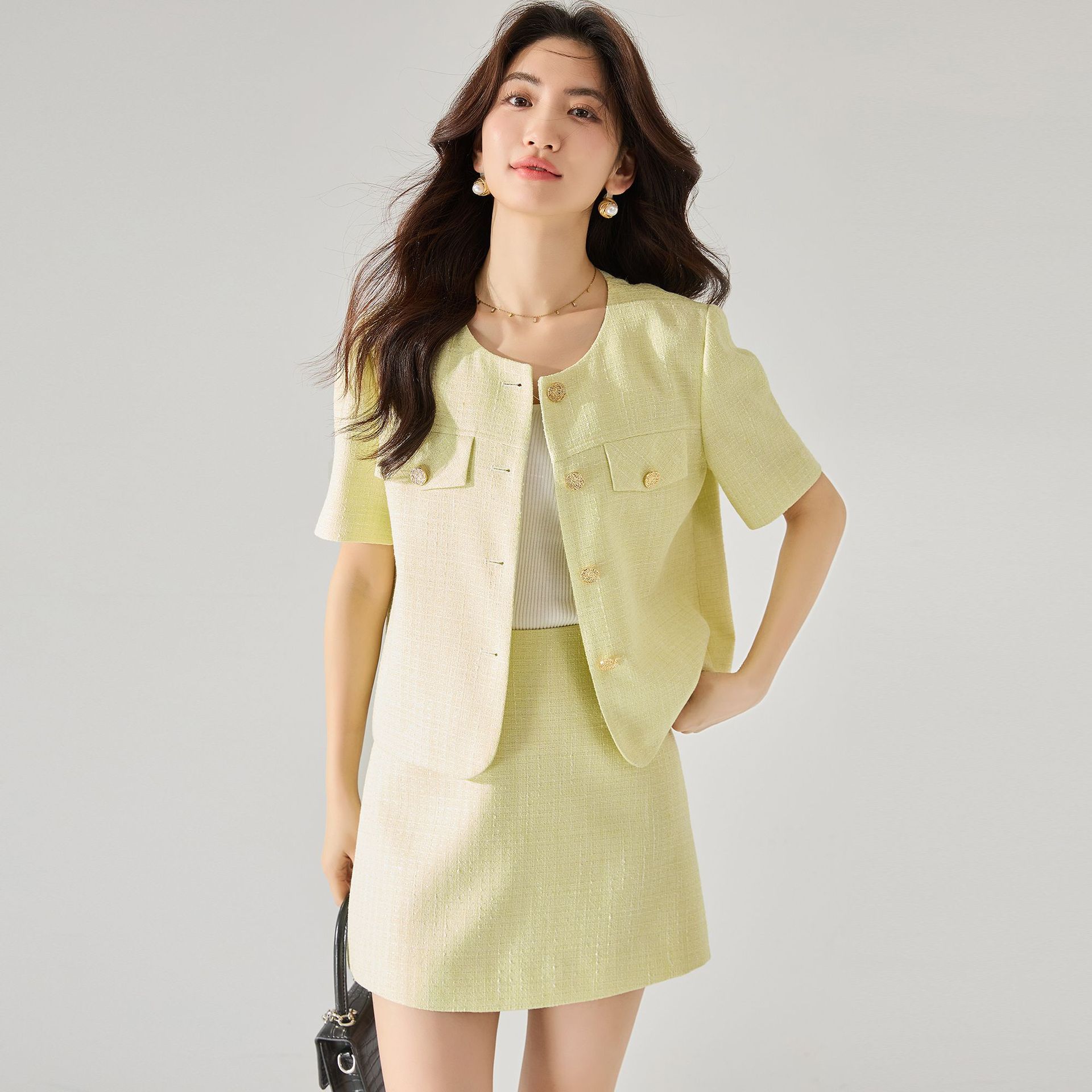 厳選された軽くて涼しい、着痩せ効果のある、白く見える小香風半袖スーツトップス15580ショートスカート779.05kg点セット