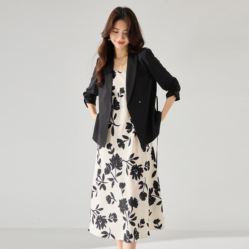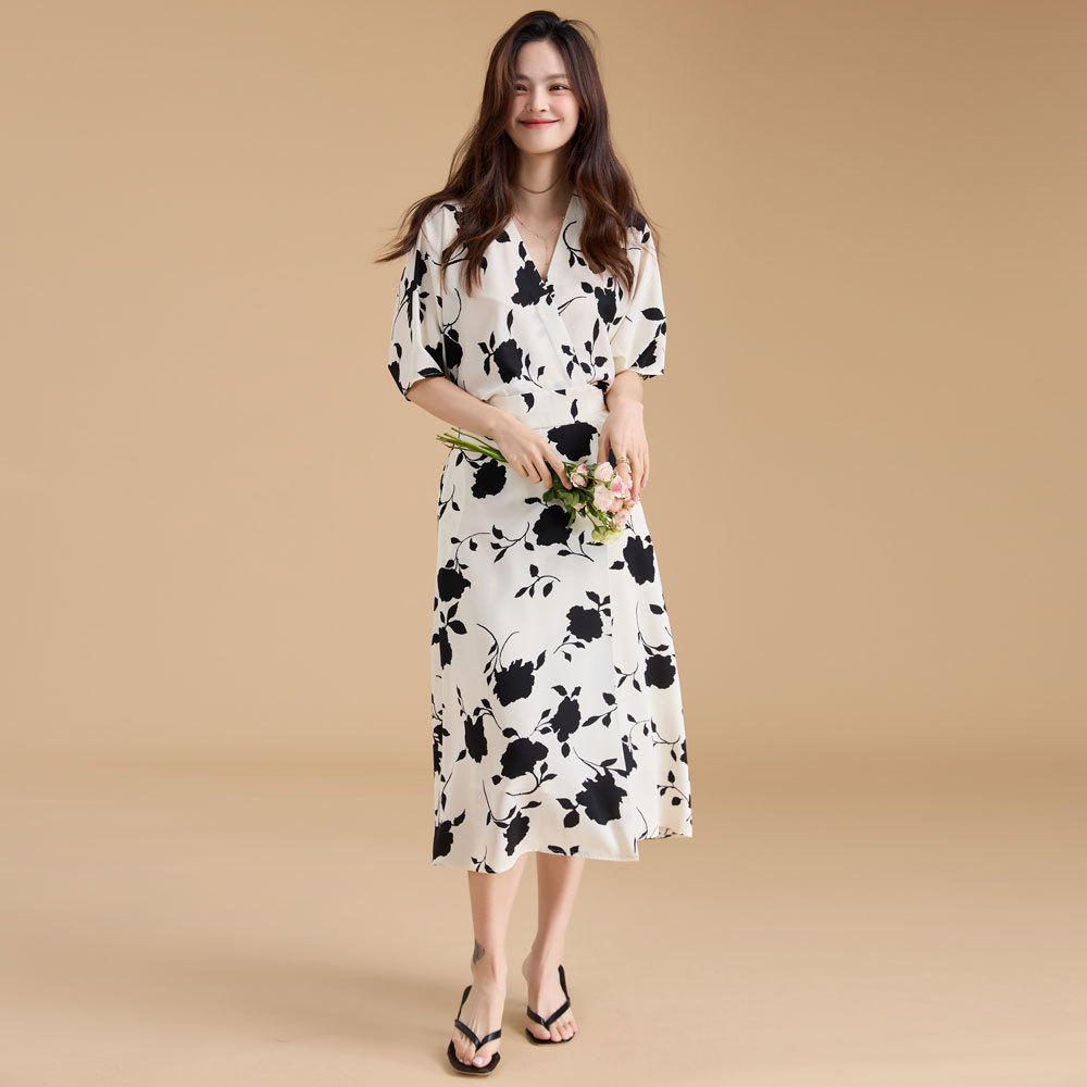 25 クリアランス夏国民スタイルフレンチレトロ黒と白のプリントワンピースラップスカート中国のエレガントなドレス 232501