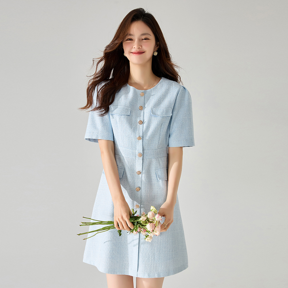 25厳選された新しい気質明るい色のフレンチスリムハイウエストスモールフレグランス半袖ウエストミドル丈ドレス22052