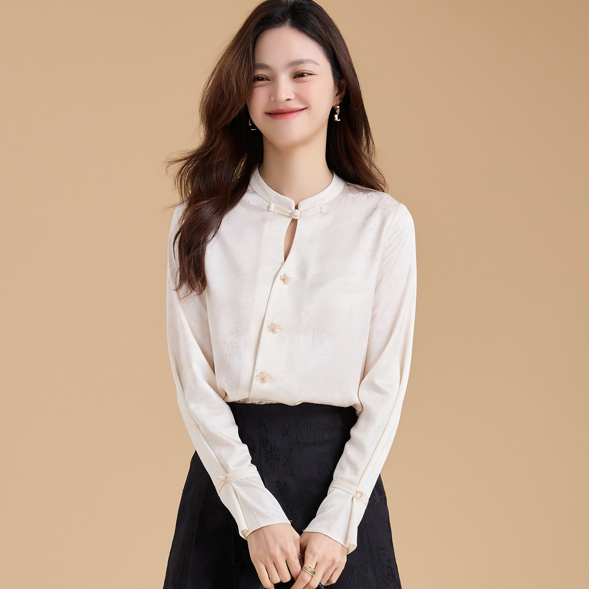 25 秋の新中国風サテンジャカードシャツ女性のライト国民スタイル手作りボタンニッチ気質通勤トップ 15556