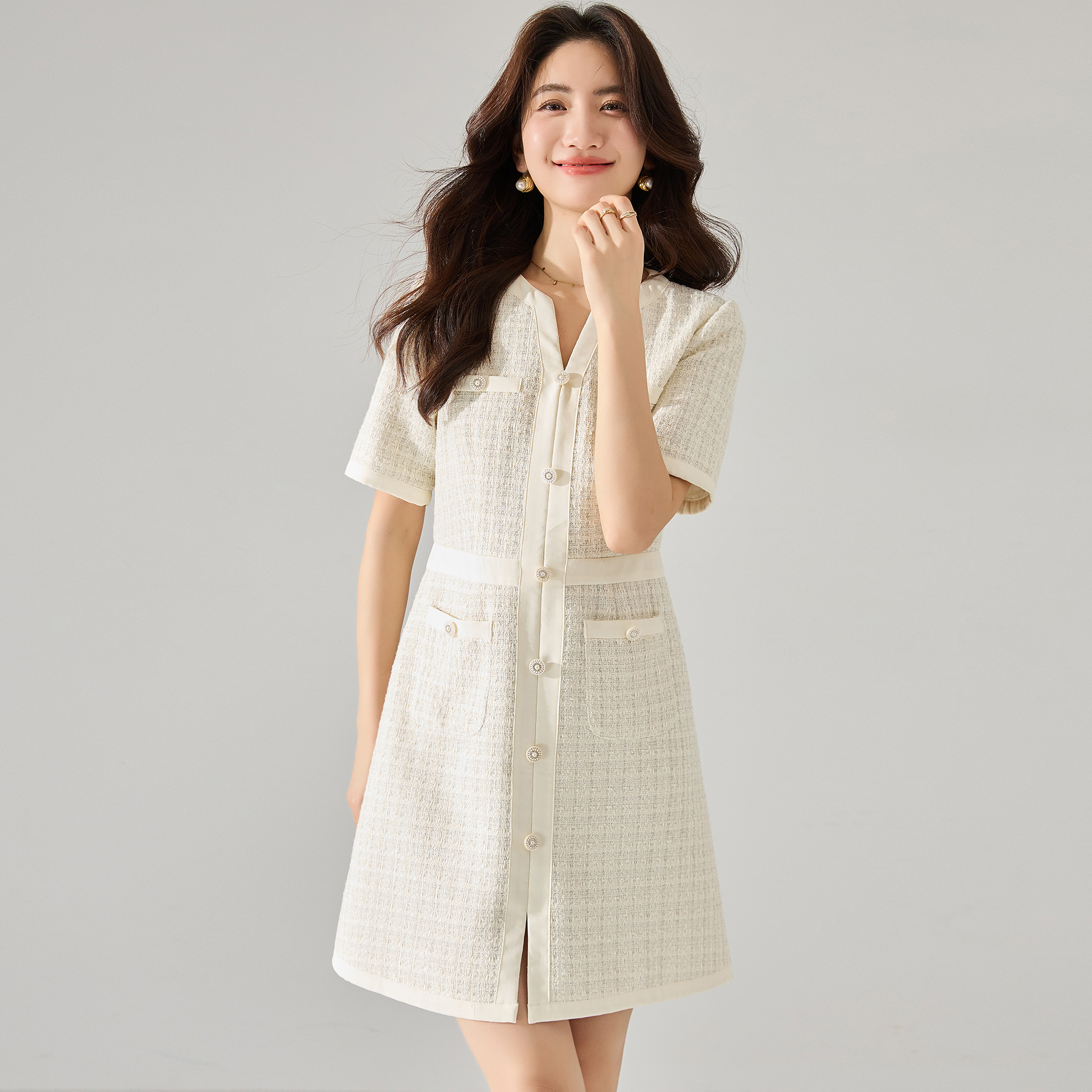 25厳選の優しく絶妙なハイウエストスリムAライン小祥気質明るいシルクツイード半袖ウエストドレス15576