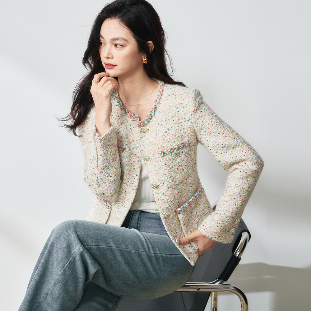 25秋【Xinghe Moon Night】高級スモールフレグランススタイルウールウールカラーストライプテクスチャーラウンドネック気質ジャケット25068